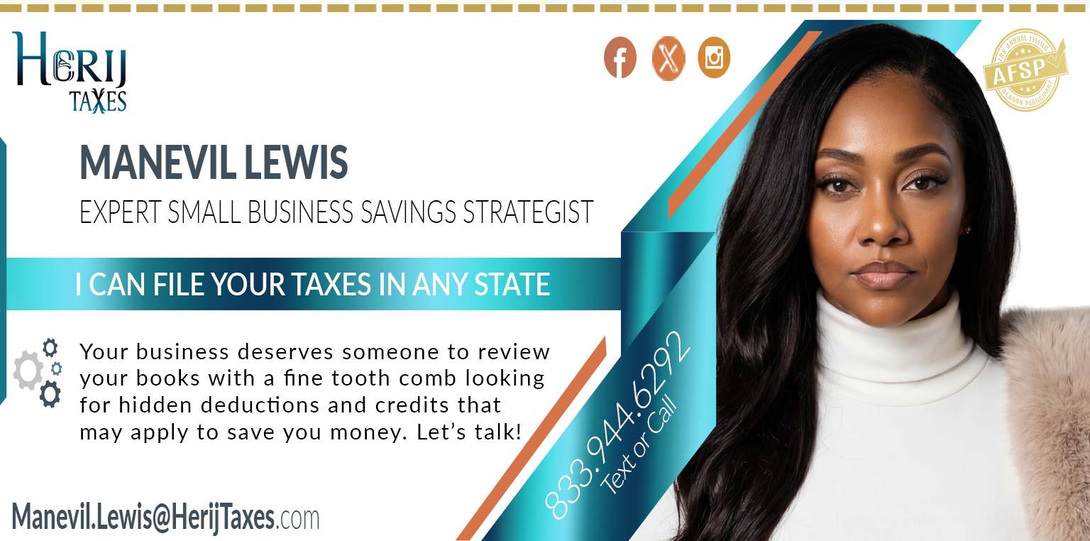 My company, Herij Taxes specializes in working with clients that need to file a 1040 form, Schedule C, 1120S, and Partnership returns.